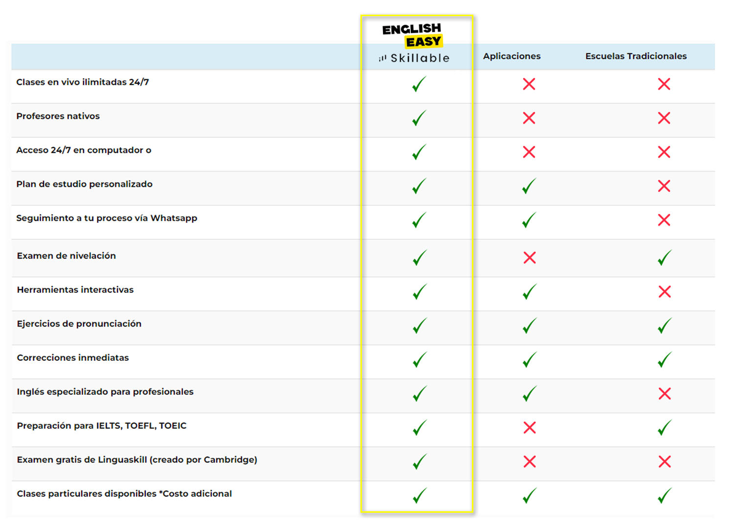 ¡Estudiar inglés nunca fue tan Easy! Ver planes ¡Es una papa! Trabajamos con el aval de Skillable, una plataforma adaptada a tus necesidades. La cual te ayudará a progresar en el idioma universal en tus tiempos libres desde tu computadora o celular. Ver planes Easy Planes Easy BASIC $18.000 x mes El ideal para un rápido progreso Plataforma con clases grupales ILIMITADAS de conversación y vocabulario 24/7 Contactanos Easy SILVER $35.000 x mes Con una clase individual para atender consultas junto a uno de nuestros profesores Plataforma + 1 clase INDIVIDUAL semanal Contactanos Easy GOLD $50.000 x mes Sacá el máximo provecho a tu profesor particular Plataforma + 2 clases INDIVIDUALES semanales Contactanos Easy PLATINUM $70.000 x mes Sacá el máximo provecho a tu profesor particular Plataforma + 3 clases INDIVIDUALES semanales Contactanos Easy MASTER $100.000 x mes Trabaja de forma personalizada con tu docente con una clase diaria Plataforma + 5 clases INDIVIDUALES semanales Contactanos ¡Comenzá ahora mismo! Pre-Inscribite GRATIS 0800-362-4999 Preinscripción GRATUITA Completá el siguiente formulario y reservá tu lugar, sin compromiso y de manera GRATUITA. Por favor, activa JavaScript en tu navegador para completar este formulario. Ciudad Nombre Teléfono Nombre y apellidoTeléfonoE-mailCiudadEnviar ¡SOMOS TU MEJOR ELECCIÓN! Click en imagen para hacer zoom COMENZÁ AHORA